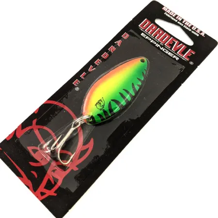 1/2 oz (14 g) paino antaa tarvittavan massan heittotarkkuuteen ja uintisyvyyden ylläpitämiseen kelauksen aikana. Dardevle Devle Dog UV:ssä on näyttävä Fire Tiger -viimeistely, jossa kirkkaat oranssin, keltaisen ja vihreän sävyt on jaettu terävillä mustilla pystyraidoilla. UV-valolle altistuessaan uistin paljastaa modernin taktisen etunsa loistamalla kirkkaan vihreänä, mikä on tarkoitettu parantamaan näkyvyyttä hämärissä olosuhteissa. Eppinger valmistaa näitä edelleen Michiganissa käyttäen omia muottejaan, jotka luovat tunnusomaisen pitkänomaisen muodon ja syvän koveran pinnan – muotoilu periytyy Lou Eppingerin vuoden 1906 Detroitin ajoilta. Messinkinen tausta lisää klassista metallista välkettä, joka täydentää maalattua puolta. Tuotekoodilla 13092 varustettu uistin on pituudeltaan 5,5 cm (2 1/4") ja se on varustettu terävällä kolmihaarakoukulla ja kestävyyttä tarjoavalla uistinrenkaalla. Tuote on käyttämätön ja se toimitetaan alkuperäisessä musta-punaisessa pakkauksessaan.