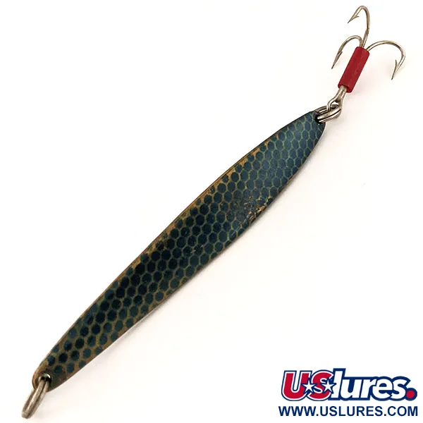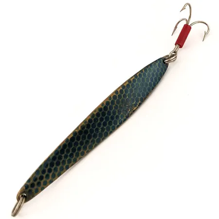 31 g (1 oz) paino tarjoaa tarvittavan tiheyden syvien rakenteiden tavoittamiseen tai tuulen läpäisyyn pitkissä heitoissa. Tässä Johnson Lujon -mallissa, tuotekoodilla 13032, on näyttävä sininen hunajakennokuvio, joka tuo visuaalista ilmettä sen 9 cm (3 1/2") runkoon. Metallipinta on poikkeuksellisen hyvin säilynyt, ja tuotteen kuntoluokitus on 5/5, joten se on valmis kokoelmaan tai suoraan käyttöön. Kolmihaarakoukun juuressa oleva punainen muoviholkki toimii klassisena visuaalisena houkuttimena ja iskupisteenä kaloille. Pitkänomainen profiili ja vatsan puolen loiva köli ovat tyypillisiä vuosisadan puolivälin amerikkalaisille metalliuistimille, jotka on tarkoitettu jigaamiseen tai heittokalastukseen. Molemmat päät on varustettu kestävillä uistinrenkailla, mikä takaa varmat liitokset perukkeeseen ja koukkuun. Valmistettu Yhdysvalloissa, tämä yksilö heijastaa kestäviä valmistusmenetelmiä, jotka tekivät Johnson-merkistä peruskäsitteen pystyjigauksessa.