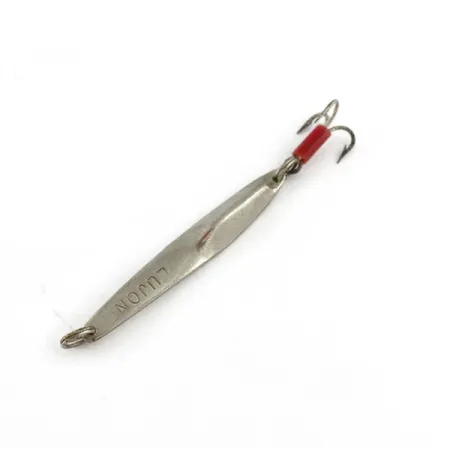 Nikkelipinnoite antaa tälle solakalle pystypilkille kirkkaan ja heijastavan pinnan, joka säilyy erittäin näkyvänä vielä vuosikymmenten jälkeen valmistuksesta. Tämä 1/8 oz (3,5 g) painava ja 1 1/2" (4 cm) pitkä Johnson Lujon – tuotekoodiltaan 23519 – on erinomainen esimerkki vuosisadan puolivälin amerikkalaisesta kalastusvälinevalmistuksesta. Runkoon on stanssattu Lujon-nimi selkeillä tekstauksilla, mikä on tyypillistä näille klassisille pystypilkeille. Sen koukut ja renkaat ovat erinomaisessa kunnossa; kolmihaarakoukun varressa on pieni punainen hylsy, joka toimii hienovaraisena iskupisteenä. Kuntoluokituksella 5/5 metallipinnassa ei ole juurikaan käytön jälkiä. Rakenne on selkeä ja kestävä, ja siinä käytetään yksinkertaisia uistinrenkaita sekä kärjessä että perässä siiman ja koukun kiinnittämiseksi USA:ssa valmistettuun runkoon.