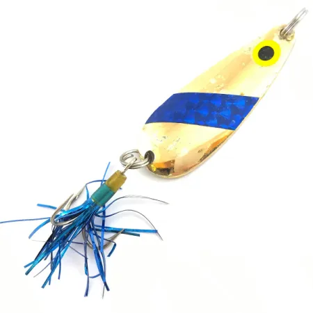 Tämä 10g (1/3oz) painoinen Lindy Finsel -lusikkauistin on varustettu klassisella kullatulla viimeistelyllä ja kirkkaalla sinisellä holografisella raidalla. Pituudeltaan 5,5cm (2 1/4") oleva pisaranmuotoinen runko on Lindy / Little Joe -valmistusperinteelle ominainen. Tässä nimenomaisessa yksilössä (tuotekoodi 4530) on maalattu keltainen silmä mustalla pupillilla lähellä ylempää uistinrengasta. Koukutuksena on terävä kolmihaarakoukku, joka on koristeltu sinisellä kimalteella (tinsel) ja kiinnitetty kaksivärisellä turkoosi-kultaisella kauluksella. USA:ssa valmistettu metallirunko kuvastaa Lindy-Little Joen tuon ajan korkealaatuisia pinnoitustekniikoita. Kuntoarvio on 4/5; pinta on puhdas ja hyvin säilynyt, säilyttäen alkuperäisen kiiltonsa sekä metallissa että koristeteipissä. Uistimen sisäpuolelle stanssattu merkkileima takaa aitouden keräilijöille.