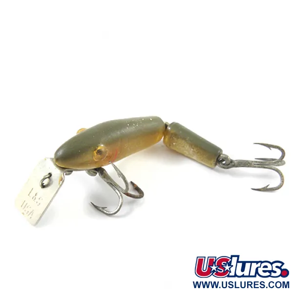Metalliseen uintilevyyn on selvästi leimattu klassinen "L&S USA" -merkki, joka tunnistaa tämän vieheen aidoksi L&S Bait Companyn tuotteeksi. Tässä MirrOlure Bass-master -yksilössä on nivelletty runko, ja sen väritys on hienovaraisen Golden Natural, joka vaihtuu oliivinvärisestä selästä lämpimään, läpikuultavaan vatsaan. Koko on 1 1/2" (4 cm) ja paino 1/16 oz (2 g), mikä tekee vieheestä kompaktin työkalun heittokalastukseen. Tuotekoodilla 2747 vieheessä on alkuperäiset varusteet, mukaan lukien kaksi vatsapuolelle asennettua kolmihaarakoukkua ja sille ominainen metallilevy. Kuntoarvio on 4/5, sillä pintaviimeistely ja rakenteellinen eheys ovat säilyneet vahvoina molemmissa runko-osissa.