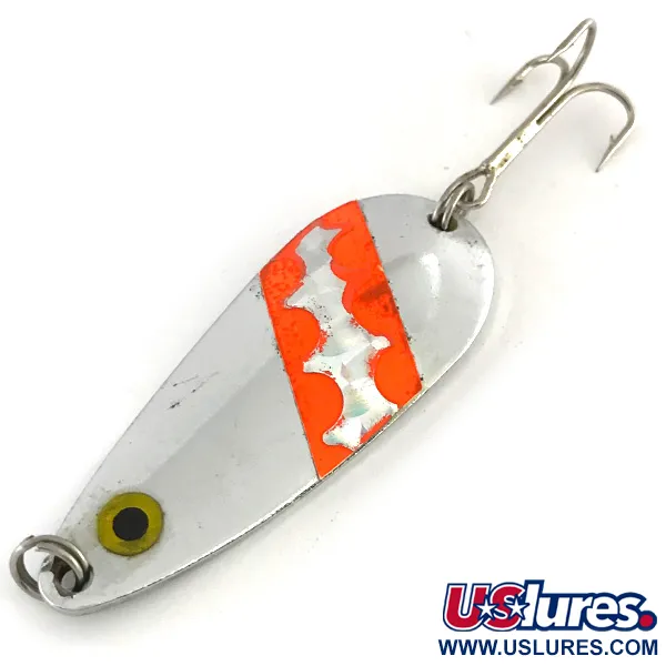 Tämä 6 cm pitkä Moriyama-lusikkauistin on esimerkki taidokkuudesta, jota tapaa usein vuosisadan puolivälin japanilaisissa kalastustarvikkeissa. Kiillotettu nikkeli / punainen viimeistely on näyttävä, ja siinä on leveä vino puna-oranssi raita, joka kehystää valoa heijastavan poimutun hopeisen upotuksen. Etupuolella keltainen ja musta silmä toimii huomiopisteenä lähellä siimakiinnitystä. Tämä tuotekoodilla 8278 tunnistettu uistin painaa 16 g, mikä antaa sille hyvän tuntuman heittämiseen tai uisteluun. Vieheen takapuolelta löytyy koveraan nikkelipintaan leimattu valmistajan merkki "Moriyama Japan". Koukut ja renkaat, mukaan lukien kolmihaarakoukku ja uistinrenkaat, ovat erinomaisessa kunnossa (arvosana 5/5).