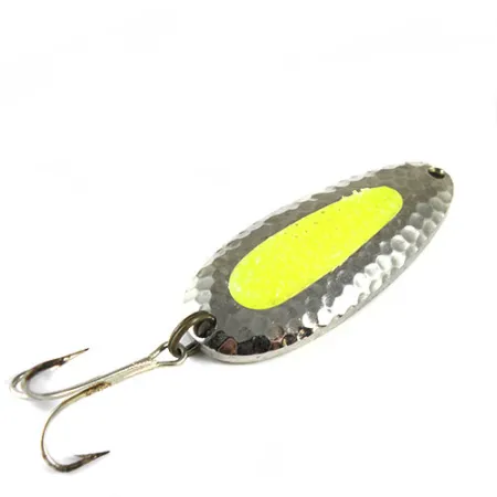 Raskas vasaroitu nikkelipinta antaa tälle 28 g (1 oz) lusikkauistimelle selkeän heijastavan pinnan, joka kerää valoa jopa syvissä tai sameissa vesissä. Tässä Nebco Pixee -vieheessä, tuotekoodi 0510, on tunnusomainen neonkeltainen lohenmäti-insertti, joka oli National Expert Bait Co. -aikakauden määrittelevä muotoiluelementti ennen tuotemerkin siirtymistä Blue Foxille. Pituudeltaan 6,4 cm (2 1/2") oleva raskas messinkirunko antaa tarvittavan massan syvien jokimonttujen tavoittamiseen tai pitkiin heittoihin rannikkotuulessa. Kääntöpuolelle on stanssattu Nebco PIXEE -nimi ja patenttitiedot, vaikka tämä yksilö on merkitty 7/8 oz -painoiseksi, vaikka se painaa täydet 28 g (1 oz) luettelon teknisten tietojen mukaisesti. Kuntoluokitus on 4/5, ja vieheessä on kevyttä pinnallista kulumista nikkelipinnoitteessa sekä vähäistä tummumaa alkuperäisessä kolmihaarakoukussa. Se on suunniteltu monipuolisiin tekniikoihin, tasaisesta kelauksesta meren aallokossa tumbling-tyyppiseen esittelyyn jokivirroissa kirjolohelle ja lohelle. Keltainen insertti toimii visuaalisena ärsykkeenä, joka jäljittelee mätiä, tehden siitä perusvarusteen taimenen ja lohen kalastajille.