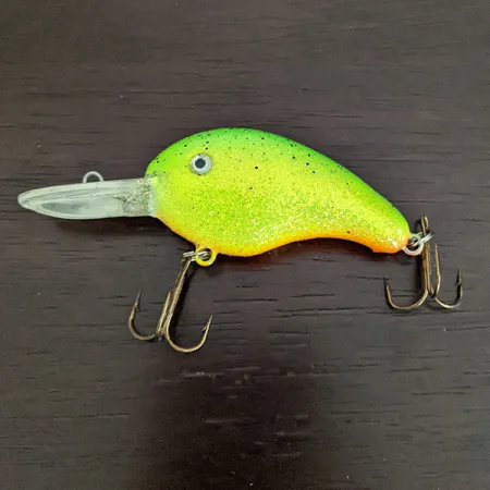 Valossa kimalteleva, hileillä höystetty neonvihreä ja keltainen väritys antaa tälle syvännevaapulle erinomaisen näkyvyyden vesipatsaassa. Tämä Strike King 4XD (tuotekoodi 16418) on 5 cm pitkä ja painaa 10 g, mikä tekee siitä erinomaisen valinnan niin heittokalastukseen kuin uisteluun. Sen pitkä, läpinäkyvä uintilevy on suunniteltu viemään viehe 2,4–3,6 metrin uintisyvyyteen, erityisesti syvänteiden rakenteissa lymyäviä kuhia ja haukia tavoiteltaessa. Sisäinen räminäkammio tuo rytmikkään ääniärsykkeen sen uintiin. Tässä yksilössä näkyy käyttöhistoria (kuntoluokitus 3/5), pintajälkiä löytyy jonkin verran ja alkuperäisissä kolmihaarakoukuissa on ajan tuomaa patinaa, mutta ne ovat täysin toimintakuntoisia. Väritys vaihtuu selän kirkkaasta chartreusesta vatsan hienovaraiseen oranssiin, mikä heijastaa Strike Kingin tunnettuja perinteisiä väriyhdistelmiä.
