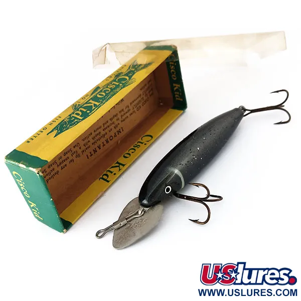 Tämän 14 gramman (1/2 oz) painoisen vintage-yksilön syvälle sukeltava profiili saa ominaispiirteensä sen ylisuuresta, säädettävästä metallisesta uintilevystä. 9,5 cm:n kokonaispituus tekee Wallsten Tackle Cisco Kid -vaapusta varteenotettavan valinnan raskaaseen hauen ja muskien kalastukseen. Tuotekoodilla 10173 tunnistettavassa vieheessä on syvänmusta viimeistely hopeisilla pilkuilla ja selkeä valkoinen rengas niska-alueella. Tämä yksilö on käyttämätön ja säilynyt alkuperäisessä kelta-vihreässä rasiassa läpinäkyvän muovikannen alla. Säädettävä metallilevy on Cisco Kid -sarjan tunnusmerkki, ja se on suunniteltu kalastajan itse säädettäväksi, jotta saavutetaan haluttu syvyys olosuhteiden mukaan. Alkuperäisten pakkausohjeiden mukaan nämä manuaaliset säädöt mahdollistavat tarkan syvyyden hallinnan uistelussa tai heittokalastuksessa. Maalatut silmät, valkoiset mustilla keskipisteillä, erottuvat selvästi tummasta, pilkullisesta rungosta.