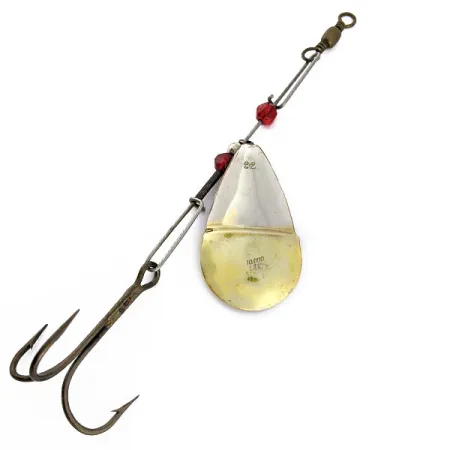 Tämä klassinen 10000 Lakes 92 -malli on pituudeltaan 14 cm (5 1/2") yläleikarista kolmihaarakoukun kärkeen, ja se on aito vintage-lippa. Pisaranmuotoisessa lehdessä on erottuva kaksisävyinen nikkeli- ja kultaviimeistely, ja sen kääntöpuolella on selkeä punainen väritehoste. Lankarunkoon on pujotettu särmikkäitä punaisia helmiä, jotka tuovat visuaalista kontrastia ja toimivat välikappaleina pyöriville osille. Tämä 14 gramman (1/2 oz) painoinen uistin on painotettu tehokkaaseen heittoon tai uisteluun, ja se on rakennettu kestävän lankarungon varaan. Se on valmistettu USA:ssa ja siinä on tuotekoodi 18910. Mallin nimi on stanssattu lehteen, mikä vahvistaa sen alkuperän. Kuntoarvio on 4/5, mikä osoittaa vain vähäisiä käsittelyn jälkiä uistimen säilyttäessä alkuperäisen kiiltonsa ja rakenteellisen eheyden.