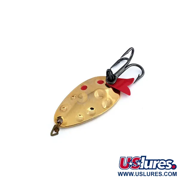 Tämä 5 g (3/16 oz) painoinen vintage-lusikka on varustettu klassisella vasaroidulla pinnalla ja pisaranmuotoisella rungolla. Kullanväristä pintaa koristavat kolme selkeää punaista pistettä lähellä kärkeä, mikä on Acme Fish Hawk -sarjan tunnusmerkki. Tuotekoodilla 9923 tunnistettava harvinainen yksilö ei ole enää tuotannossa, mikä tekee siitä merkittävän löydön amerikkalaisen kalastushistorian harrastajille. Uistin on varustettu tummalla kolmihaaralla ja punaisella muovisella houkutuslevyllä. Pituudeltaan 3 cm (1 1/4") olevan lusikan taustapuoli on kiillotettu peilikirkkaaksi. Kuntoarvio 5/5 kertoo metallipintojen ja alkuperäisten osien erinomaisesta säilyvyydestä. Pieni messinginsävyinen kolmiomainen uistinrengas kärjessä takaa kestävän kiinnityksen.