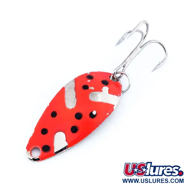 Fluoresoiva punainen maali peittää tämän 3 cm (1 1/4") lusikan pintaa, jossa on selkeä musta pistekuvio nikkelipohjalla. Tämä 3,5 g (1/8 oz) painava Acme Little Cleo, tuotekoodiltaan 10721, on viimeistelty UV-aktiivisella pinnoitteella, joka hehkuu voimakkaasti tummissa vesissä tai ultraviolettivalossa. Osia kirkkaasta nikkelipinnoitteesta on jätetty näkyviin maalin läpi korkean visuaalisen kontrastin luomiseksi. Varustukseen kuuluu kestävä uistinrengas ja hopeaviimeistelty kolmihaarainen koukku. Nykyisessä 5/5-kunnossaan uistin vaikuttaa poikkeuksellisen hyvin hoidetulta, ja maali sekä metallinen kiilto ovat säilyneet ehjinä. Tämä USA:ssa valmistettu klassikko hyödyntää ainutlaatuista kyhmyistä muotoaan saavuttaakseen sille ominaisen uintiliikkeen heitossa tai uistelussa.