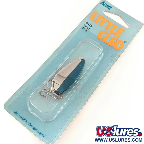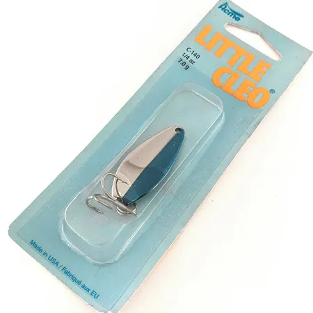 Tämä amerikkalaisvalmisteinen lusikkauistin on pituudeltaan 4 cm (1 1/2") kaarevaa runkoaan pitkin ja siinä on perinteinen kaksivärinen muotoilu, joka takaa korkean visuaalisen kontrastin. Viimeistely on kirkas Nikkeli / Sininen, joka on levitetty Acme Little Cleo -sarjalle ominaiseen kyhmyiseen muotoon. Tuotekoodilla 11346 (valmistajan malli C-140/NNB) luetteloitu uistin on alkuperäisessä blisterpakkauksessaan. Tämä yksilö on kunnoltaan 6, mikä tarkoittaa, että se on käyttämätön ja siinä on jäljellä tehtaan alkuperäinen kiilto sekä pinnoitteessa että kolmihaarakoukussa. Painoltaan 7 g (1/4 oz) lusikka on suunniteltu heittotarkkuutta silmällä pitäen, ja sen päässä on klassinen meistetty logo. Pakkauksen kääntöpuolella on kaksikielinen teksti, joka kertoo sen yli viisi vuosikymmentä kestäneestä suosiosta pohjoisamerikkalaisten kalastajien keskuudessa.