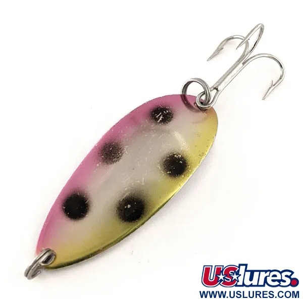Tämän 11g (2/5oz) lusikan kääntöpuolella oleva leimaus osoittaa sen selvästi aidoksi USA:ssa valmistetuksi klassikoksi. "Rainbow Trout" -viimeistely on huolellisesti tehty, ja siinä on pehmeä liuku yläreunan ruusunpunaisesta kirkkaankeltaiseen alaosaan, heijastavalla hopeanvalkoisella ytimellä, jota korostaa kuusi vahvaa mustaa täplää. Pituudeltaan 5,5cm (2 1/4") oleva yksilö on moitteettomassa kunnossa ja saanut kuntoluokituksen 5/5. Paksu metallirunko on yhdistetty kestäviin ruostumattomasta teräksestä valmistettuihin uistinrenkaisiin ja vahvaan kolmihaarakoukkuun, mikä tekee siitä vankan valinnan heittoon tai uisteluun. Tuotekoodilla 11688 tunnistettu Acme Little Cleo on keräilijöiden keskuudessa tunnettu selkeästä, leimatusta "Little Cleo" -brändäyksestä ja painomerkinnästä kiillotetulla hopeisella taustapuolella.