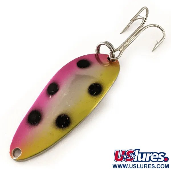 Tämä 9 gramman (1/3 oz) Acme Little Cleo -lusikkauistin, jonka kääntöpuolelle on meistetty "WIGL LURE" -merkintä, edustaa yhdysvaltalaisen uistimenvalmistuksen klassista aikakautta. Etupuolella on eloisa Rainbow Trout -kuviointi, jossa kirkkaan vaaleanpunainen reuna sulautuu valkoiseen keskustaan ja keltakultaiseen vatsaan, viimeisteltynä kuudella tarkasti sijoitetulla mustalla pisteellä. Uistimen pituus on 4,5 cm (1 3/4"), ja sen kaareva profiili on suunniteltu vakaaksi niin heitossa kuin uistelussa. Tämä yksilö (tuotekoodi 11689) on 5/5-kunnossa; siinä on puhdas, heijastava kromitausta ja virheetön maalipinta. Alkuperäiset varusteet, kuten uistinrengas ja kolmihaarakoukku, ovat tallella ja kirkkaat. Syvä ja selkeä "LITTLE CLEO" -leima vahvistaa tämän keskikokoisen lusikan alkuperän.