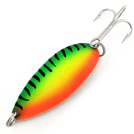 Kiillotettuun hopeiseen taustapuoleen selvästi stanssatut merkinnät "LITTLE CLEO" ja "3/4 OZ." (21 g) vahvistavat tämän amerikkalaisvalmisteisen klassikon identiteetin. Pituudeltaan 6,5 cm (2 1/2") olevassa mallissa on eloisa Fire Tiger -väritys, jolle ominaisia ovat voimakkaat mustat raidat vihreästä keltaiseen ja oranssiin liukuvalla pohjalla. Paksu metallirakenne ja selkeä kyhmyinen muoto ovat Acme Tackle Companyn suunnittelun tunnusmerkkejä, jotka auttavat viehettä säilyttämään syvyytensä vesipatsaassa tasaisessa kelauksessa. Tämä nimenomainen yksilö, tuotekoodiltaan 11849, on 5/5-kunnossa, siinä on puhdas pinta ja terävä kolmihaarakoukku, joka on kiinnitetty kestävällä uistinrenkaalla. Sisäpuolen paksu pinnoite antaa kirkkaan välähdyksen, joka kontrastoi hyvin näkyvän maalatun ulkopinnan kanssa. Sekä heitto- että uistelukäyttöön suunniteltu 21 g (3/4 oz) lusikkauistimen painonjakauma mahdollistaa pitkät heitot jopa vastatuuleen.