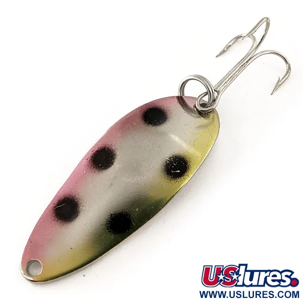 Tämä tarkalleen 9 g (1/3 oz) painava siirtymävaiheen yksilö edustaa merkittävää hetkeä kalastusvälinehistoriassa, ja siinä on alkuperäisen Wigly Lure Companyn "WCL LURE" -leima Little Cleo -brändäyksen rinnalla. Nickel / Trout -viimeistely on asiantuntevasti toteutettu: toisella kyljellä on pehmeä vaaleanpunainen liukuväri ja toisella hillitty oliivinkeltainen, joiden keskellä on kirkas nikkelirunko ja kuusi selkeää mustaa pistettä. Pituudeltaan 4,5 cm (1 3/4") olevan lusikan pisaramainen muoto on tunnusomaista varhaisille USA:ssa valmistetuille Acme-tuotantoerille. Siinä on alkuperäiset varusteet, mukaan lukien puhdas kolmihaarakoukku ja uistinrengas, jotka liittyvät tuotekoodiin 12085. Tämä uistin on upeassa kunnossa (arvosana 5/5), ja sen leimattu hopeanhohtoinen tausta sekä maalattu etupuoli ovat säilyneet kirkkaina ja hyvinä.