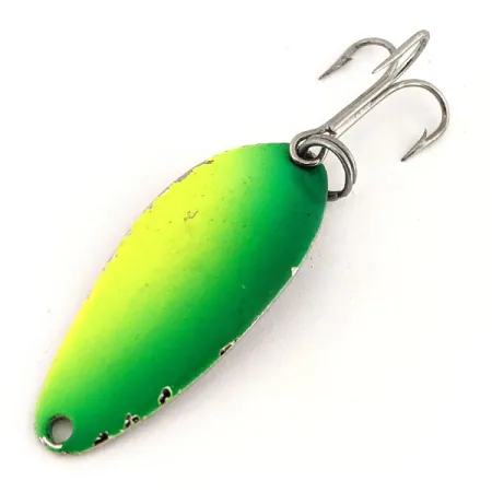 Nikkelöityyn kääntöpuoleen on selkeästi leimattu nimi « LITTLE CLEO ® » ja paino 1/4 oz. (7 g), mikä tunnistaa tämän lusikan aidoksi palaksi pohjoisamerikkalaista kalastushistoriaa. Kuperaa pintaa peittää eloisa vihreästä keltaiseen vaihtuva liukuväri, joka on klassinen Acmen väritys suunniteltu maksimoimaan näkyvyys eri vesiolosuhteissa. Vaikka maalipinnassa on käytön jälkiä ja pieniä lohkeamia reunoilla vieherasiassa vietetyn ajan seurauksena, alla oleva metalli on edelleen kirkas, mikä oikeuttaa 4/5 kuntoluokitukseen. Tämän 1 1/2" (4 cm) pituisen yksilön varustukseen kuuluu vankka uistinrengas ja terävä kolmihaarakoukku, jotka ovat merkkejä luotettavasta yhdysvaltalaisesta laadusta. Tässä nimenomaisessa vieheessä, tuotekoodi 12746, on ikoninen kyhmyselkäinen muoto, joka on tehnyt Little Cleosta suosikin heittokalastukseen niin seisovassa kuin virtaavassa vedessä.