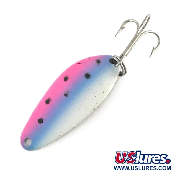 Takapuolen kiillotettuun nikkeliin on lyöty selkeästi 1/4oz (7g) painomerkintä yhdessä tunnistettavan merkkileiman kanssa. Etupuolen Trout-väritys tarjoaa hyvän näkyvyyden vaaleanpunaisen, sinisen ja valkoisen pystyraidan sekä kuuden mustan pisteen ansiosta. Tasan 1 1/2" (4cm) pitkä paksuseinäinen metallirunko on suunniteltu heittokalastukseen tai uisteluun eri petokaloille. Varustukseen kuuluu vahva uistinrengas ja terävä kolmihaarakoukku, joissa kummassakaan ei ole ikääntymisen merkkejä. Tuotekoodilla 8289 luetteloitu Acme Little Cleo on klassinen esimerkki yhdysvaltalaisesta kalastusvälineestä. Yksilön kuntoluokitus on 5/5, sillä maalipinta on virheetön ja nikkelöity tausta säilyttää peilimäisen kiiltonsa.