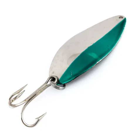Tämän raskaan lusikkauistimen viimeistely on jaettu pystysuunnassa kahtia, yhdistäen kiillotetun nikkelin ja kirkkaan vihreän raidan. Painoltaan 35g (1 1/4 oz) oleva Acme Little Cleo, tuotekoodiltaan 9827, on suunniteltu pitkiin heittoihin tai syvien vesikerrosten saavuttamiseen uistelussa. 8cm (3 1/4") messinkirungossa on tunnusomainen kyhmyprofiili, joka on tehnyt tästä USA:ssa valmistetusta vieheestä lohen- ja jalokalan kalastajien kestosuosikin sukupolvien ajan. Kääntöpuolelle on stanssattu selkeästi nimi "LITTLE CLEO". Tämä yksilö on erinomaisessa 5/5-kunnossa ja siinä on kirkas, heijastava pinta. Se on varustettu vahvalla kolmihaarakoukulla ja kestävällä uistinrenkaalla, ja kärki on porattu siististi viehelukkoa tai suoraa kiinnitystä varten.