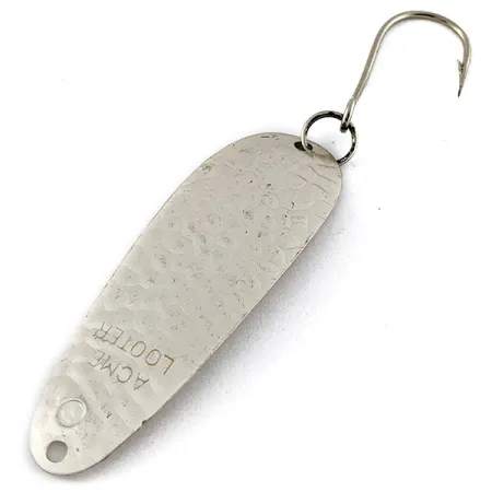 4 g (1/8 oz) rungon vasaroitu hopeapinta luo monisärmäisen heijastavan pinnan, joka on suunniteltu heijastamaan valoa tehokkaasti uistelussa. Tuotekoodilla 20485 tunnistettava 6 cm (2 1/4") Acme Looter on erikoislusikka, joka edustaa perinteisen amerikkalaisen metallityön yksinkertaisuutta. Taustapuoli on sileä ja siinä on selkeästi meistetty valmistajan ja mallin nimi, ja koko viehe on hienossa 5/5-kunnossa. Pisaranmuotoisen rungon peräpäähän on kiinnitetty yksihaarakoukku vahvalla uistinrenkaalla, ja kärjessä on tarkasti porattu kiinnitysreikä.