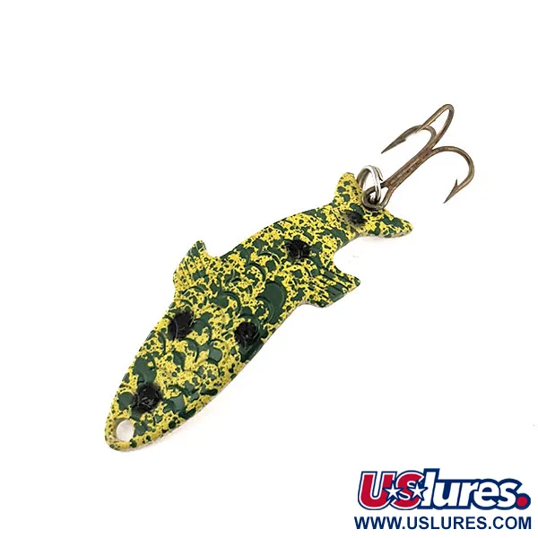 Tämän yksilön kaarevaa metallirunkoa peittää erottuva 'Frog'-kuviointi, joka koostuu vihreistä ja keltaisista roiskeista sekä vahvoista mustista täplistä. Uistin painaa 1/8 unssia (4 g) ja on pituudeltaan 1 1/2" (4 cm). Siinä on se ominainen anatominen siluetti, joka on tehnyt Acme Phoebesta kalastuspakkien suosikin jo vuosikymmenten ajan. Tämä kyseinen tuote, tuotekoodiltaan 11506, on käyttämätön ja siinä on alkuperäinen viimeistely. Puhtaalla, hopeansävyisellä kääntöpuolella 'PHOEBE'-nimi on stansattu selkeästi metalliin keskikohdan lähelle. Varustukseen kuuluu terävä, pronssiviimeistelty kolmihaarainen koukku, joka on kiinnitetty luotettavalla uistinrenkaalla pyrstöön. Kolmiulotteisen stansatun muotoilunsa ansiosta se näyttää realistiselta syöttikalalta useista eri kulmista heitettäessä tai vedettäessä.