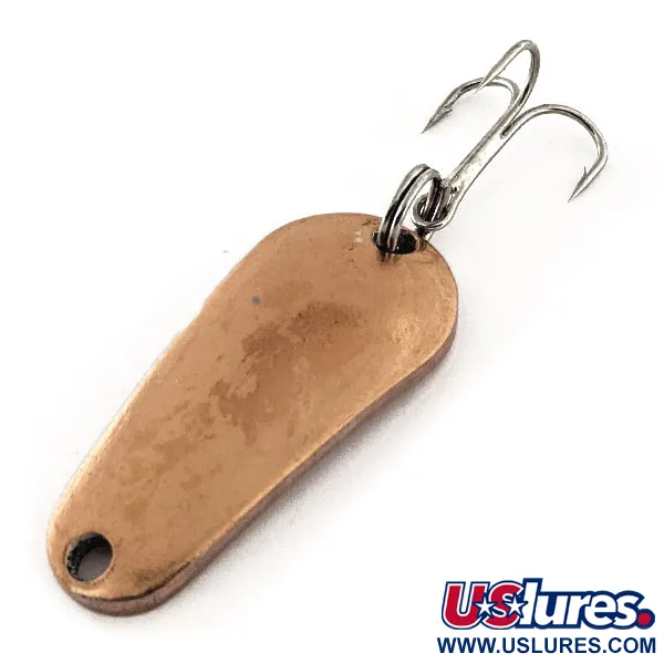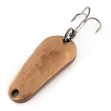 Lämmin kupariviimeistely määrittelee tämän klassisen amerikkalaisen lusikan, joka heijastaa valoa vintage-metallivieheille tyypillisellä pehmeällä hohdolla. Aeroplane Spinner -yhtiön Yhdysvalloissa valmistama Aero-malli (tuotekoodi: 11796) edustaa selkeää ja tehokasta uistinmuotoilua. Se painaa 7 g (1/4 oz) ja on pituudeltaan 3,7 cm (1 1/2"). Sen pisaranmuotoiseen runkoon on stanssattu hienovarainen kaarevuus antamaan uintiliikettä. Viehe on käyttämätön ja 5/5-kunnossa, pinta on puhdas ja kulumaton. Siinä on hopeanvärinen uistinrengas ja terävä kolmihaarakoukku, jotka muodostavat hienon kontrastin kuparirungon täyteläiselle punakultaiselle sävylle.