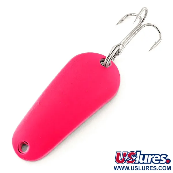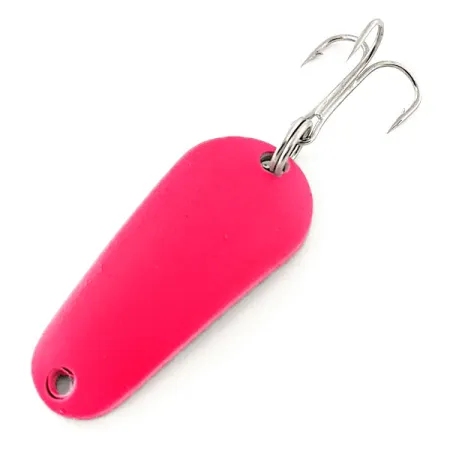 Tämä Aero-lusikka on pituudeltaan kompakti 3,7 cm (1 1/2"), ja sen pisaranmuotoinen runko on viimeistelty erittäin erottuvalla fluoresoivalla vaaleanpunaisella. Ultraviolettivalossa pinta muuttuu, kun UV-reaktiivinen pinnoite hehkuu syvän punaisena, mikä parantaa näkyvyyttä hämärässä. Terävä kolmihaarakoukku on kiinnitetty uistinrenkaalla meistetyn metallin leveämpään päähän, kun taas siiman kiinnitysreikä sijaitsee kapeassa kärjessä. Tämä tuotekoodilla 12051 tunnistettu yksilö on peräisin Yhdysvalloista, ja se on 5/5-kunnossa tasaisella ja kirkkaalla pinnallaan. Painoltaan 7 g (1/4 oz) uistin on suunniteltu monipuoliseen heittokalastukseen ja vertikaalijigaukseen. Aeroplane Spinner -yritys käytti tätä erityistä fluoresoivaa maalia korostamaan klassisen 'Aero'-sarjan uistimiensa profiilia.