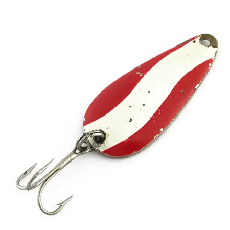 Painoltaan 1/4 oz (8 g) on tämä Aeroplane Spinner -lusikka 2" (5 cm) pituinen amerikkalaisen uistinsuunnittelun klassikko. Etupuolta koristaa selkeä puna-valkoraitainen kuviointi, jossa on reunoilla pieniä jälkiä ja vähäistä maalipinnan kulumista, mikä vastaa 4/5-kuntosuositusta. Kääntöpuolen messinkipinnassa on selkeä ”Aero”-leima, joka tunnistaa kyseisen mallin. Tuotekoodilla 9206 tunnistettu viehe sisältää alkuperäistyylisen kolmihaarakoukun. Messinki on tummunut ajan myötä kauniisti, mikä luo jyrkän kontrastin vastakkaisen puolen maalattuun emaliin. Valkoisissa raidoissa on nähtävissä pieniä kulumajälkiä, mikä kertoo vieheen nähneen käyttöä vesillä.