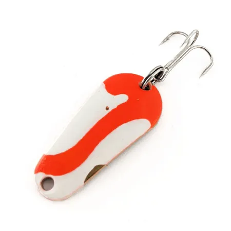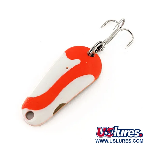 Silmiinpistävä fluoresoiva oranssi aalto halkoo tämän amerikkalaisvalmisteisen lusikkauistimen pintaa, tarjoten erinomaisen näkyvyyden sameissa vesissä. Aeroplane Spinner Aero UV, tuotekoodiltaan 11537, on pituudeltaan 4 cm (1 1/2") ja painoltaan 7 g (1/4oz). Sen väritys koostuu puhtaanvalkoisesta pohjasta ja rohkeasta oranssista raidasta, jonka alta alkuperäinen kultapinnoite kuultaa alareunassa. UV-valossa oranssi pigmentti reagoi voimakkaasti, mikä on tekninen ominaisuus syvän veden kalastukseen tai pilvisille päiville, jolloin valon tunkeutuvuus on vähäistä. Viehe on varustettu tavallisella kolmihaarakoukulla, joka on kiinnitetty uistinrenkaalla perään. Maalipinta on tarkka ja selkeärajainen, ja metalliosat ovat poikkeuksellisen puhtaat, vastaten 5/5 kuntoluokitusta. Aeroplane Spinner on käyttänyt näitä kestäviä pinnoitteita varmistaakseen vieheen pitkäikäisyyden vuosia kestävän heittokalastuksen ja jiggauksen aikana.
