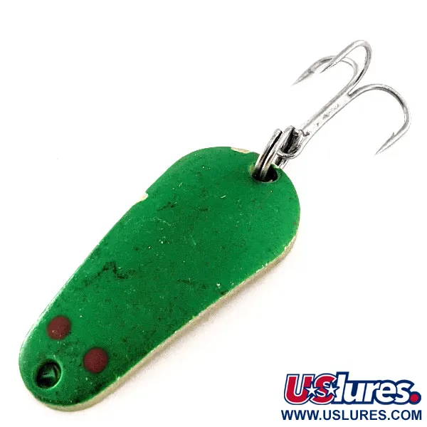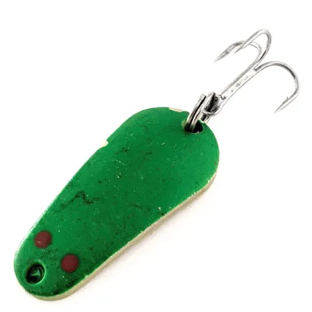 Pituudeltaan tasan 1 1/2" (3,7 cm) oleva Aeroplane Spinner -merkin kompakti lusikkauistin on varustettu etupuolen kirkkaanvihreällä viimeistelyllä, jota korostaa kaksi punaista pistettä siimalenkin lähellä. Paino on 1/4 oz (7 g), ja se on keskitetty tarkkoja heittoja varten vaihtelevissa olosuhteissa. Kääntöpuolella on puhdas kultaviimeistely, joka tarjoaa klassisen kontrastin vihreälle päävärille. Ultraviolettivalossa "Aero UV" -pinnoite (tuotekoodi 11792) osoittaa erikoislaatunsa hehkumalla voimakkaasti, mikä on taktinen etu syvissä tai sameissa vesissä. Varustukseen kuuluu yksi terävä kolmihaarakoukku, joka on kiinnitetty uistinrenkaalla, mikä on tyypillistä USA:ssa valmistetuille käyttöpainotteisille välineille. Tämä yksilö on poikkeuksellisessa 5/5-kunnossa ja säilyttää alkuperäisen kiiltonsa sekä maalatuilla että metallipinnoilla.