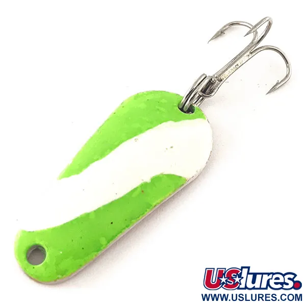 Kuparirunko kätkeytyy silmiinpistävän vihreän ja valkoisen fluoresoivan pintamaalin alle tässä amerikkalaisvalmisteisessa lusikkauistimessa. Pituudeltaan 3,7 cm (1 1/2") uistin on suunniteltu erittäin näkyväksi, sillä maali reagoi voimakkaasti UV-valoon. Tämä Aeroplane Spinner -yksilö, tuotekoodi 12054, painaa 7 g (1/4oz), mikä antaa riittävästi painoa tarkkaan heittämiseen ja syvyyden hallintaan. Viimeistely on loistavassa kunnossa (5/5), ja aaltokuvio on säilynyt selkeänä ja ehjänä. Yksi uistinrengas yhdistää terävän kolmihaarakoukun lusikan takaosaan. Kapeneva profiili takaa vakaan vajoamisen jiggauksessa ja rytmikkään välkkeen kelattaessa.
