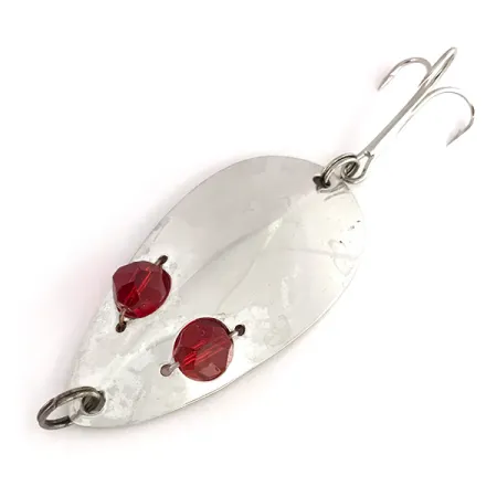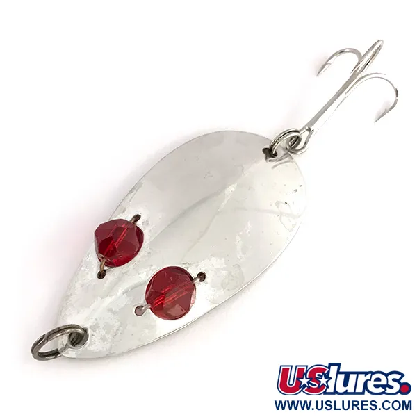 Kaksi eloisaa punaista hiottua helmeä on upotettu suoraan tämän kanadalaisvalmisteisen lusikkauistimen vasaroituun nikkelirunkoon, mikä on Allcock, Laight & Westwoodin valmistusperinteen tunnusmerkki. Viehe painaa 21 g (3/4 oz), ja sen lehtimäinen muoto on pituudeltaan 6,5 cm (2 1/2") säilyttäen korkeakiiltoisen viimeistelyn. Koveralla puolella näkyy selvästi "AL&W TORONTO" -leima, eikä metallissa ole kulumisen merkkejä, mikä vastaa 5/5-kuntosuositusta. Tuotekoodilla 7903 tunnistettu viehe on varustettu terävällä kolmihaarakoukulla ja kaksoisuistinrenkailla varmoja liitoksia varten. Nikkelipinnoitteen vasaroitu pinta luo klassisen ulkonäön ja heijastaa valoa tehokkaasti vedessä heitettäessä tai vetouistelussa.