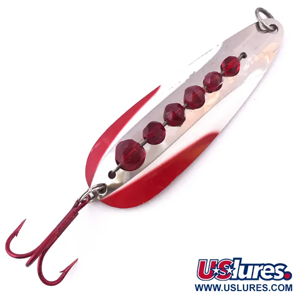 Kuusi viistehiottua punaista lasikiveä on upotettu tarkasti tämän paksuseinäisen nikkelilusikan selkään. Ne heijastavat valoa useista eri kulmista jäljitellen saaliskalan välkettä. Huomattavan 28 g (1 oz) painonsa ja 8,5 cm (3 1/4") pituutensa ansiosta AL&W Toronto Jeweled Watertek on varma valinta heitto- tai uistinkalastukseen syvemmissä vesissä. Kanadalaisen AL&W Tacklen valmistamassa mallissa 4002 on klassinen Nikkeli / Punainen -väritys, jossa alapuolen reunat on korostettu kirkkaanpunaisella kontrastina kiillotetulle hopeapinnalle. Varusteet ovat kestäviä, mukaan lukien sävyyn sopiva punainen kolmihaarakoukku, joka viimeistelee ulkoasun. Viehe on 4/5-kunnossa, ja sen kääntöpuolella on selkeät, luettavat leimat. Leimoihin kuuluu merkintä 'CAN PAT REG 1931', mikä on tunnusomaista näille varhaisille kanadalaisille malleille, joissa yhdistyivät näyttävyys ja järeä rakenne. Pienet uistinrenkaat päässä ja pyrstössä pitävät kokonaisuuden kasassa, joten viehe on valmis joko kokoelmiin tai suurten petokalojen pyyntiin.