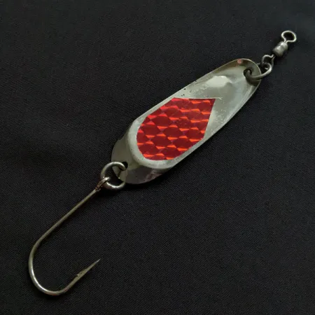 Punainen prismateippi luo korkeakontrastisen iskupisteen tämän 7 gramman (1/4 oz) klassikon niklatulle rungolle. Tasan 6 cm (2 1/4") pituinen Andy Reekers -lusikkauistin edustaa USA:n länsirannikon uistintuotannon kultakautta. Varustukseen kuuluu vankalla uistinrenkaalla kiinnitetty suuri yksihaarainen koukku sekä valmiiksi asennettu leikari, joka ehkäisee siiman kiertymistä. Tuotekoodilla 20373 varustettu uistin on siistikuntoinen (kuntoluokitus 4/5), ja siinä on vain vähäisiä merkkejä sen vintage-historiasta. Pitkänomainen ja solakka profiili on tyypillinen lusikoille, jotka on suunniteltu monipuoliseen heittokalastukseen tai uisteluun.