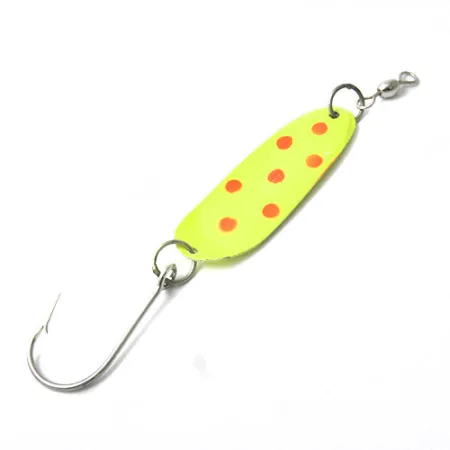 Punaisilla ympyröillä kirkkaankeltaisella pohjalla koristeltu Andy Reekers 3 heijastaa Yhdysvaltojen puolivälin vuosisadan vetouisteluvälineiden selkeää visuaalista tyyliä. Tässä 4,5 g (3/16 oz) painoisessa mallissa, tuotekoodiltaan 0440, on yksinkertainen mutta tehokas profiili, joka on suunniteltu vakaaseen liikkeeseen vesipatsaassa. Kääntöpuoli on tasaisen keltainen, ja kärjen lähellä on mustakeltainen kohdesilmä, joka tarjoaa toisen kiintopisteen seuraaville kaloille. Se on varustettu yksittäiskoukulla ja eteen asennetulla leikarilla, jotka ovat välttämättömiä vakauden ylläpitämiseksi ja siiman kiertymisen estämiseksi uistelun aikana. Tuote on 5/5-kunnossa, ja siinä on alkuperäinen tehdaspinta sekä rungossa että osissa.