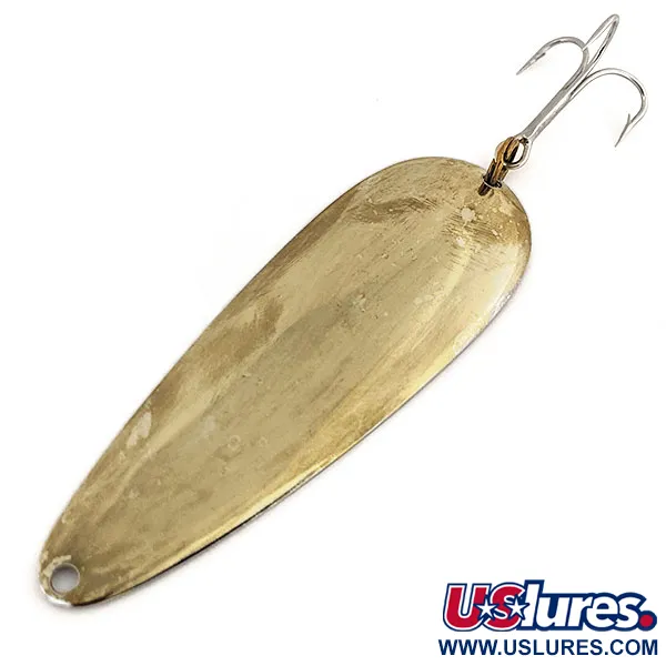 Tämä valmistajan merkinnällä "NEBCO MPLS. MINN. U.S.A." sisäkaareen leimattu vintage-metalliuistin on esimerkki varhaisten amerikkalaisten lusikkauistimien toiminnallisesta yksinkertaisuudesta. Kooltaan 9 cm (3 1/2") pitkä Aqua Spoon painaa 21 g (3/4 oz), mikä riittää syvän veden heittokalastukseen tai syvyyden säilyttämiseen hitaassa uistelussa. Kultainen väri on säilynyt kirkkaana kauttaaltaan, ja siinä on vain vähäisiä käytön jälkiä, mikä nostaa sen kuntoluokitukseen 4/5. Yksi suuri kolmihaarakoukku on kiinnitetty vahvalla uistinrenkaalla takareunaan, kun taas etupään siiman kiinnityspiste on yksinkertainen, siisti aukko pisaranmuotoisen rungon kapeassa päässä. Tässä tuotekoodilla 12755 yksilöidyssä kappaleessa on sileä, kiillotettu ulkopinta, joka on suunniteltu maksimoimaan välkehdintä erilaisissa valaistusolosuhteissa.