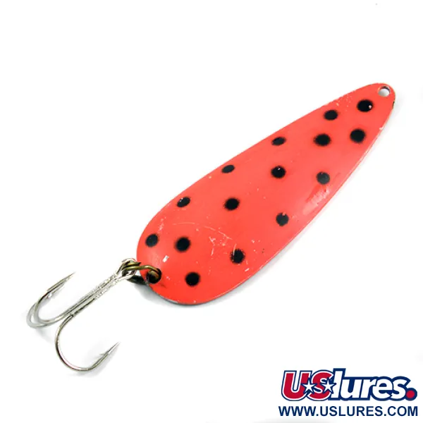 Tämä 9 cm (3 1/2") pituinen viehe erottuu edukseen pitkänomaisella profiilillaan, kirkkaanpunaisella etupuolellaan ja kontrastisilla mustilla pisteillään. Tuotekoodilla 2459 luetteloitu lusikkauistin on varustettu kiillotetulla nikkelitaustalla, johon on selvästi lyöty merkinnät "AQUA SPOON" ja "MADE IN USA". 21 gramman (3/4 oz) paino viittaa uistimeen, joka on suunniteltu pitkiin heittoihin tai syvyyden pitämiseen uistelussa hauelle tai suurille taimenille. Kunnoltaan viehe on erinomainen (4/5) ja siinä on vain minimaalisia käytön jälkiä. Alkuperäinen kolmihaarakoukku on kiinnitetty vahvalla uistinrenkaalla, ja maali on säilyttänyt hyvin alkuperäisen kiiltonsa nikkelipohjan päällä.