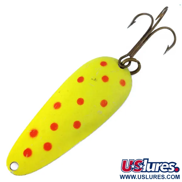 Tämä 7 cm (2 3/4") pituinen lusikkauistin on varustettu erittäin erottuvalla keltaisella pohjavärillä, jota täydentävät selkeät punaiset täplät. Tämä Nebcon Aqua Spoon UV, tuotekoodiltaan 10859, painaa 17 g (3/5 oz) ja se on suunniteltu heittokalastukseen tai uisteluun vaihtelevissa valo-olosuhteissa. Vieheen kääntöpuoli on perinteistä nikkeliä, joka tarjoaa metallisen välkkeen kirkkaan etupuolen vastapainoksi. Tämän Yhdysvalloissa valmistetun mallin erikoisominaisuus on fluoresoivuus; kuten kuvista näkyy, viehe hohtaa voimakkaan vihreänä UV-valossa. Varustukseen kuuluu tukeva uistinrengas ja terävä, tummasävyinen kolmihaarakoukku. Maalipinta on säilynyt kirkkaana ja metallipinnat ovat puhtaat, joten tämä vintage-viehe on kunnoltaan täydet 5/5.