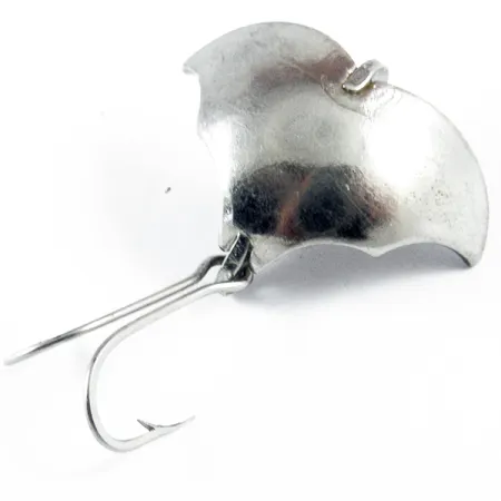 Tämä vain 2 cm (0 3/4") pituinen kompakti viehe on osoitus vuosisadan puolivälin amerikkalaisesta kalastusvälinesuunnittelusta. Tämä nikkelipintainen yksilö, tuotekoodiltaan 3505, painaa 5 g (3/16 oz) ja sen on valmistanut Harrison Industries Yhdysvalloissa. Erottuva lepakkosiipiprofiili on valmistettu yhdestä muotoillusta metallinpalasta, ja nimi "Baby Bat" on selvästi meistetty siipien alapuolelle. Viehe on erittäin siistissä kunnossa, arvosanalla 5/5 säilyneen metallisen kiillon ja pinnan kulumattomuuden ansiosta. Takapäähän on kiinnitetty vankka kaksihaarainen koukku integroidun lankasilmukan kautta, mikä on vakiovarustus näissä erikoistuneissa pintakalvossa tai aivan pinnan alla uivissa metallivieheissä. Keskikoli tuo rakenteellista jäykkyyttä ja johtaa pieneen siimalenkkiin etukaaren huipulla.