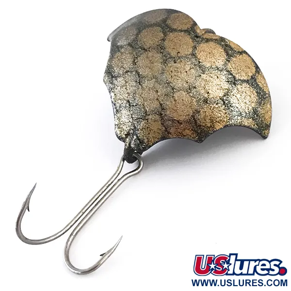 14 g paino antaa tälle metallivieheelle runsaasti massaa sen pienestä 3,5 cm koosta huolimatta. Prescott Spinner -yhtiön USA:ssa valmistama Baby Bat (tuotekoodi 5435) hyödyntää erottuvaa lepakon siiven muotoista siluettia, joka on tämän vintage-mallin tunnusmerkki. Yläpinta on viimeistelty näyttävällä Black / Gold -kuviolla, jossa on suuria kultaisia suomukuvioita painettuna tumman, teksturoidun pohjan päälle. Vieheen kääntäminen paljastaa tasaisen mattamustan alapuolen, jossa on suoraan prässättyyn metallirunkoon integroitu keskellä oleva pystysuora vakautusevä. Koukutus on poikkeuksellisen hyvin säilynyt, ja takalenkkiin on kiinnitetty vankka kaksoiskoukku. Tämä yksilö saa kuntoluokituksen 5/5, ja siinä on erittäin vähän kulumista, jota usein nähdään näissä vintage-amerikkalaisissa heittouistimissa. Kultainen pyöreä suomukuvio pysyy terävänä ja kirkkaana tummaa taustaa vasten.