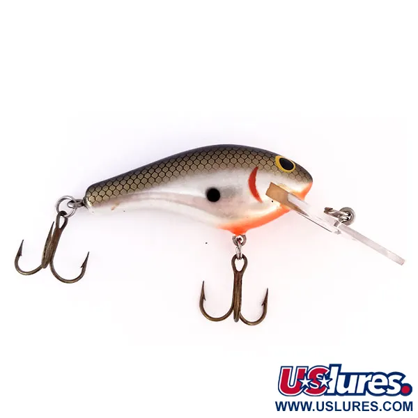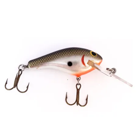 Tämä korkealaatuisesta balsapuusta valmistettu klassinen vaappu painaa tasan 12 g (2/5 oz). Sen 6 cm (2 1/4") rungossa on huolellisesti viimeistelty shad-kuviointi, jota korostavat tumma hunajakennokuvio selässä ja hohtavat hopeiset kyljet. Visuaalisina yksityiskohtina ovat selkeä musta kylkitäplä, kaareva punainen kidusviiva ja kirkkaan oranssi nieluosa. Suuret keltaiset silmät mustilla pupilleilla luovat voimakkaan kontrastin, mikä on ominaista Bagleyn amerikkalaiselle käsityölle. Nokkaan on integroitu suuri, kirkas uintilevy, jossa on tehdasasenteinen uistinrengas varmaa kiinnitystä varten. Koukkuina on kaksi terävää, pronssinsävyistä kolmihaarakoukkua. Erittäin hyvin säilyneenä tämä yksilö on luokiteltu 5/5 sen puhtaan ja kiiltävän ulkonäön ansiosta. Tämä Bagley B2 -yksilö tunnistetaan tuotekoodilla 10027.