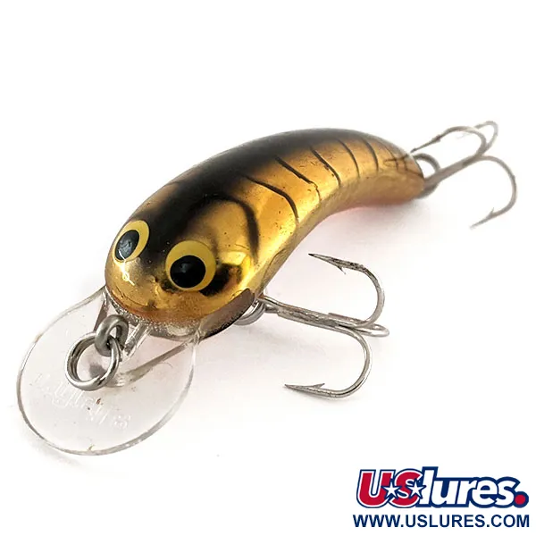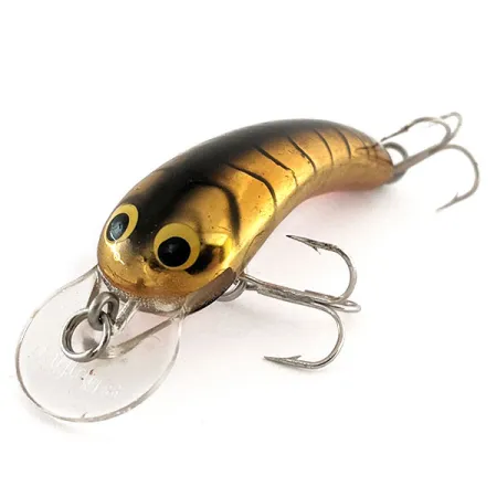 Heijastava Golden Tiger -viimeistely määrittelee tämän vintage-Bagley Smoo #2 -vaapun, jossa on metallinhohtoinen kultainen runko ja selässä vahvat tummat raidat. Tämä 7 g (1/4 oz) painava ja 6 cm (2 1/4") pitkä amerikkalaisvalmisteinen yksilö on suunniteltu matalan veden kalastukseen, jossa sen kelluvuutta voidaan hyödyntää. Vatsaan on selvästi leimattu "bagley's SMOO #2", mikä vastaa kirkkaaseen, pyöristettyyn muoviseen uintilevyyn kohokuvioitua brändäystä. Suuret keltaiset silmät jyrkän mustilla pupilleilla antavat pääosalle eloisan ilmeen, mikä on Bagleys-muotoilun tunnusmerkki tältä aikakaudelta. Varustukseen kuuluu kaksi terävää hopeapintaista kolmihaarakoukkua, jotka ovat alkuperäiset. Kunnoltaan 5/5 luokiteltu vaappu ei osoita kulumisen merkkejä kiiltävässä kultauksessa tai monimutkaisessa tiikerikuviossa. Tämä malli, tuotekoodi 11883, on haluttu harvinaisuus keräilijöille, jotka keskittyvät merkin metalliviimeistelysarjoihin.