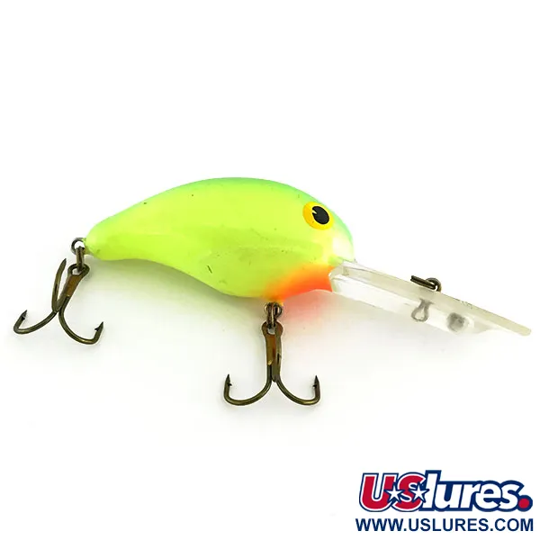 Tämä 10 gramman (1/3 oz) painoinen syvännevaappu on varustettu erittäin erottuvalla Chartreuse-viimeistelyllä, joka muuttuu pimeässä kirkkaan vihreäksi hohteeksi. 5 cm (2") runko on varustettu pitkällä läpinäkyvällä uintilevyllä, joka on suunniteltu saavuttamaan 2,4–3,6 metrin (8–12 ft) syvyys heittokalastuksessa tai uistelussa. Suuret keltaiset silmät mustilla pupilleilla luovat iskupisteen etuosaan, jota täydentää pieni oranssi täplä leuassa. Tuotekoodilla 8753 tunnettu äänekäs Bandit 300 on suosittu valinta kuhaa ja haukea syvemmistä vesikerroksista tavoitteleville kalastajille. Se on varustettu kahdella tummapintaisella kolmihaarakoukulla ja on 5/5 kunnossa. Pimeässä hohtavat ominaisuudet tekevät siitä monipuolisen vieheen yökalastukseen tai erittäin sameisiin vesiin.
