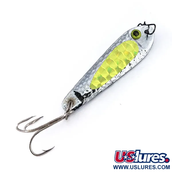 Tämä 25 g painava Bass Pro Shops pystypilkki on varustettu vasaroidulla nikkelipinnalla, joka heijastaa valoa tehokkaasti syvissä vesissä. Runko on pituudeltaan 6,5 cm, ja siihen on upotettu vihreä hunajakenno-kuvioitu teippi, joka tarjoaa selkeän fosforiloisteen hämärässä. Tuotekoodilla 10113 tunnistettu viehe on varustettu suurella silmällä ja loistavalla iiriksellä, joka toimii iskupisteenä pystysuorassa uitossa. Varustukseen kuuluu uistinrengas alapäässä terävää kolmihaarakoukkua varten sekä pikalukko yläpäässä nopeaa kiinnitystä varten. Valmistettu Yhdysvalloissa, ja se on erinomaisessa kunnossa (arvosana 5/5), puhtaalla metallipinnalla ja ehjällä teippikuviolla. Tämä raskas metalliviehe on tarkoitettu ensisijaisesti pystyjigaukseen tai pitkän matkan heittoihin, kun tavoitellaan pohjan tuntumassa oleskelevia kalalajeja.