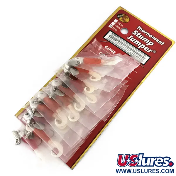 Neljä grammaa (1/8 oz) on jokaisen jigipään paino tässä alkuperäisessä Bass Pro Shops Tournament Stump Jumper -monipakkauksessa. Näissä vieheissä käytetään valkoista lyijypäätä, oranssia pehmovieherunkoa ja valkoista sirppipyrstöä, mikä on erittäin näkyvä yhdistelmä. Erottuva piirre on pieni, hopeanvärinen lippa, joka on kiinnitetty leikariin leuan alle. Se on suunniteltu luomaan metallista välkettä vieheen liikkuessa vesipatsaassa. Tämä setti, tuotekoodilla BPSJC1821 (9518), sisältää kymmenen yksittäistä viehettä alkuperäisissä pakkauksissaan, joissa on merkintä 'Gone Fishing'. White/Orange/Pink-väritys on säilynyt kirkkaana kaikissa osissa, ja setti on käyttämätön.