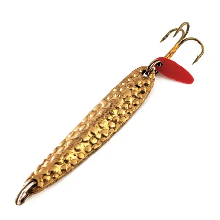 Pakotettu pronssipinnoite (messinki) luo erottuvan pintakuvioinnin tähän 4,5 cm:n pystypilkkiin. Tämä 6 g painava malli, tuotekoodiltaan 11438, kantaa klassista solakkaa profiilia, jonka Bay de Noc hioi täydelliseksi petokalojen pyyntiin vaihtelevissa olosuhteissa. Takimmaisessa uistinrenkaassa roikkuu kirkkaanpunainen muovinen houkutuslevy, joka luo voimakkaan visuaalisen kontrastin metallirunkoa vasten ja toimii iskun laukaisevana ärsykkeenä. Rakenne sisältää kestävät uistinrenkaat molemmissa päissä, mikä varmistaa alkuperäisen kolmihaarakoukun pysymisen paikallaan pystyjigauksessa tai heittelyssä. 5/5-kunnossa metalli on edelleen kirkas ja kiinnikkeet hyvin säilyneet. Perinteiset skandinaaviset uistinmallit toimivat esikuvana tälle mallille, jota Bay de Noc on valmistanut Yhdysvalloissa yli 50 vuoden ajan auttaakseen kalastajia ahvenen, kuhan ja taimenen pyynnissä.