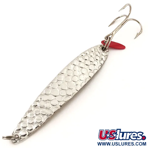 Vasaroitu nikkelipinta, kuten tässä 28g (1oz) painavassa yksilössä, on ollut syvän veden pystyjigauksen kulmakivi sukupolvien ajan. Tässä nimenomaisessa 8cm (3 1/4") pituisessa Bay de Noc Swedish Pimple -pystypilkissä on klassinen vasaroitu pinta, joka heijastaa valoa moneen suuntaan matkien syöttikalan suomukuviota. Kolmihaarakoukun lähellä on tunnusomainen punainen muovinen iskulevy, joka toimii ärsykkeenä pystyuitossa tai heittokalastuksessa. Tämä tuotekoodilla 12966 tunnistettava viehe edustaa Pimple-tuoteperheen kookkaampaa päätä, ollen varma valinta kuhan tai harmaanieriän kalastukseen. Osat ovat säilyneet kirkkaina ja yleiskunto on erinomainen 5/5. Amerikkalainen valmistus kertoo brändin pitkästä historiasta Michiganin Gladstonessa, jossa näitä vieheitä on valmistettu vuosikymmeniä. Nokan yksinkertainen uistinrengas toimii kiinnityspisteenä lukolle tai siimalle.
