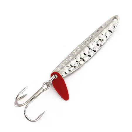 Tämä 3/16 unssin (6g) painoinen Bay de Noc Swedish Pimple 3 on varustettu vasaroidulla nikkeliviimeistelyllä, jonka tekstuuri on suunniteltu heijastamaan valoa syvässä tai sameassa vedessä. Tarkalleen 4,5cm (1 3/4") pitkä viehe, tuotekoodiltaan 11563, on varustettu ikonisella solakalla profiililla, joka on määritellyt michiganilaisvalmistajan valikoimaa vuosikymmenten ajan. Silmiinpistävä yksityiskohta on kirkkaanpunainen fluoresoiva houkutuslevy kolmihaarakoukun lähellä, joka toimii iskupisteenä petokaloille. Metallirunko ja osat ovat erinomaisessa kunnossa, vastaten 5/5 arvosanaa. Rakenne mahdollistaa pystysuoran uiton, mikä tekee siitä vakiovarusteen niin pilkkimiseen kuin kesäiseen syvän veden jigaamiseen ahvenelle tai kuhalle. Vasaroitu pinta rikkoo heijastukset matkien täkykalan suomukuviointia, ja perinteiset amerikkalaisvalmisteiset osat ovat tiukat ja toimivat.