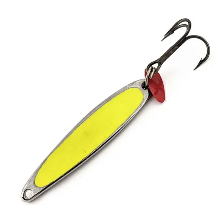 Nikkelipinnoite antaa erittäin heijastavan hopeisen pohjan, joka vangitsee kaiken saatavilla olevan valon, mikä tekee siitä erinomaisen valinnan syviin tai sameisiin vesiin. Tässä tietyssä Bay de Noc Swedish Pimple #4 UV -mallissa, tuotekoodiltaan 13119, on kirkkaankeltainen fluoresoiva upotus, joka toimii erittäin näkyvänä iskupisteenä. Painoltaan 1/4 oz (7 g) ja pituudeltaan 2" (5 cm) oleva uistimen solakka, aerodynaaminen profiili on suunniteltu tarkkuuteen pystyjigauksessa tai veneestä heitettäessä. Uistinrenkaaseen kiinnitetty pieni punainen muovinen houkutuslevy tarjoaa toisen huomiopisteen, joka toimii usein ärsykkeenä passiivisille kaloille. Varustuksesta löytyy terävä kolmihaarakoukku ja tukevat uistinrenkaat, jotka ovat ominaisia sille laadukkaalle valmistukselle, jota Bay de Noc on ylläpitänyt Yhdysvalloissa yli puolen vuosisadan ajan. Tämän yksilön kunto on erinomainen 5/5, eikä nikkelipinnassa tai keltaisessa tarrassa ole kulumisen merkkejä. Painon jakautuminen mahdollistaa hallitun vajoamisen vesipatsaan läpi varmistaen, että kalastaja säilyttää tuntuman uistimeen syvyydessä.
