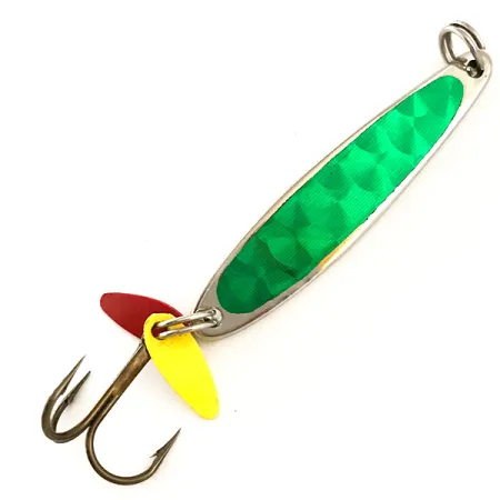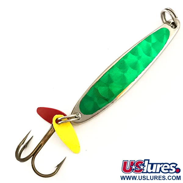 Nikkelöinti muodostaa pohjan tälle 7 g (1/4 oz) painavalle klassikolle. Yläpuolella on kirkkaanvihreä prismatarra, joka on suunniteltu keräämään ja heijastamaan valoa selkeällä timanttikuviolla. Pituudeltaan tasan 5 cm (2") oleva viehe on monikäyttöinen koko sekä pystyjigaukseen että heittokalastukseen. Peräpäässä tukeva kolmihaarakoukku kantaa tunnusomaisia muovisia houkutinlevyjä – yhtä punaista ja yhtä keltaista – jotka tarjoavat voimakkaan kontrastin hopeista runkoa vasten. Michiganilaisen Bay de Noc -yhtiön valmistama viehe heijastaa heidän pitkäaikaista kokemustaan tehokkaista pilkintä- ja jigimalleista. Kuntoarvio on 5/5, ja kääntöpuolella on kirkas, puhdas nikkelipinta ja hyvin säilynyt koristelu. Tuotekoodilla 6359 luetteloitu raskas metallirakenne varmistaa, että viehe saavuttaa kalojen oleskelusyvyyden nopeasti.