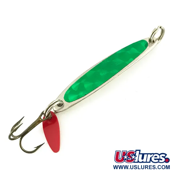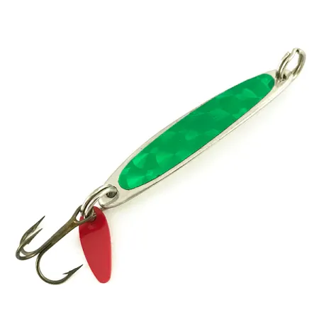 Kirkkaanvihreä prismatarra antaa tälle yksilölle erinomaisen näkyvyyden ja luo jyrkän kontrastin kiillotetulle nikkelirungolle. Pituudeltaan 1 3/4" (4,5 cm) ja painoltaan 3/16 oz (5,5 g) oleva Bay de Noc Swedish Pimple, tuotekoodi 7323, on perusvaruste tekniseen pystypilkkimiseen. Viehe on käyttämätön ja 5/5-kunnossa, säilyttäen alkuperäisen tehdaskiiltonsa Michiganin tuotantolinjalta. Sen solakka, hydrodynaaminen profiili on yhdistetty tunnusomaiseen punaiseen muoviseen houkutuslevyyn, joka on kiinnitetty pronssattuun kolmihaarakoukkuun. Tämä pieni punainen yksityiskohta toimii iskupisteenä petokaloille syvemmässä vedessä – muotoiluelementti, jota Bay de Noc on hionut vuosikymmenten ajan erikoistuessaan pystyvieheisiin. Varustuksen täydentää päädyssä oleva kestävä uistinrengas, joka on suunniteltu kestämään pystysuoraa vetoa sekä pilkkimisessä että avovesikalastuksessa.