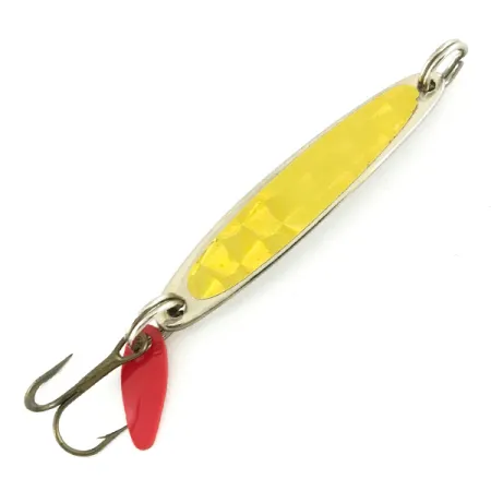 Tämä tarkalleen 4,5 cm (1 3/4") pituinen kompakti pystypilkki edustaa vuosisadan pituista amerikkalaista vieheenvalmistusperintöä Bay de Noc Lure Co:lta. Nikkeliviimeistelty runko tarjoaa vankan pohjan etupuolen kirkkaankeltaiselle holografiselle prismateipille, joka on suunniteltu heijastamaan valoa syvemmissäkin ja sameissa vesissä. Tämä nimenomainen yksilö, tuotekoodiltaan 7324, painaa 5,5 g (3/16 oz), mikä tekee siitä monipuolisen valinnan aina ahvenkaloista kuhaan. Huomioi tunnusomainen punainen muovinen houkutinlevy alimmassa uistinrenkaassa; tämä osa lisää täsmällisen väripisteen esitystapaan. Varusteet ovat erinomaisessa kunnossa: uistinrenkaat ovat puhtaat ja kolmihaarakoukku on terävä sekä kestävä. Yhdysvalloissa valmistettu Swedish Pimple on viimeistelyltään korkealuokkainen, ja siinä on puhtaat pinnat sekä eloisa keltainen upotus. Sen solakka profiili ja raskas metallirunko on suunniteltu erityisesti pystyjigaukseen niin pilkintään kuin avovesikaudellekin.
