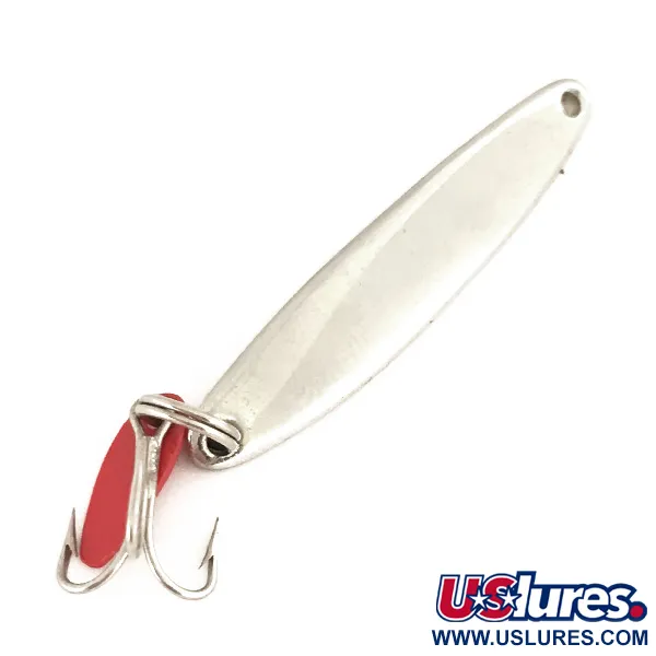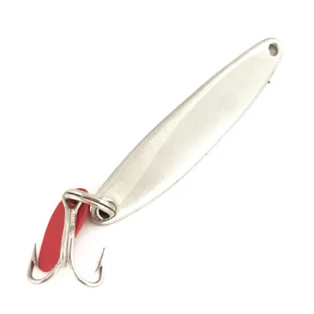 Kirkas, heijastava nikkelipinta määrittelee tämän yksilön, mikä on tavaramerkki Swedish Pimplen tehokkuudelle hämärissä olosuhteissa. Bay de Nocin Yhdysvalloissa valmistama viehe painaa 3/16 oz (5,5 g) ja on pituudeltaan 1 3/4" (4,5 cm). Mallin 7445 solakka profiili on yli vuosisadan mittaisen muotoilun kehityksen tulos, tavoitteena mahdollisimman pieni vedenvaste pystypilkinnässä jään läpi tai heitettäessä avoveteen virtauksessa. Alempaan uistinrenkaaseen on kiinnitetty erottuva punainen muovinen houkutuslevy, joka tarjoaa erittäin näkyvän fluoresoivan korosteen aivan terävän kolmihaarakoukun viereen. Tämä fluoresoiva ominaisuus toimii iskupisteenä petokaloille syvemmässä vedessä. Massiivinen metallirunko on meistetty ja kiillotettu korkeakiiltoiseksi, ja 5/5 kuntoluokituksella metallipinta on pysynyt huomattavan puhtaana ja loistavana. Kalastajat valitsevat tämän koon usein ahvenen ja kuuhan kalastukseen, vaikka sen kokoonsa nähden raskas rakenne tekee siitä yhtä sopivan syvän veden kesäpilkintään. Yläreunaan porattu reikä mahdollistaa suoran solmimisen tai lukon käytön, varmistaen, että viehe riippuu hallittuun pystyesittelyyn vaadittavassa tasapainossa.